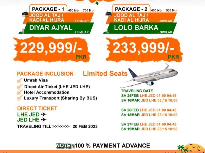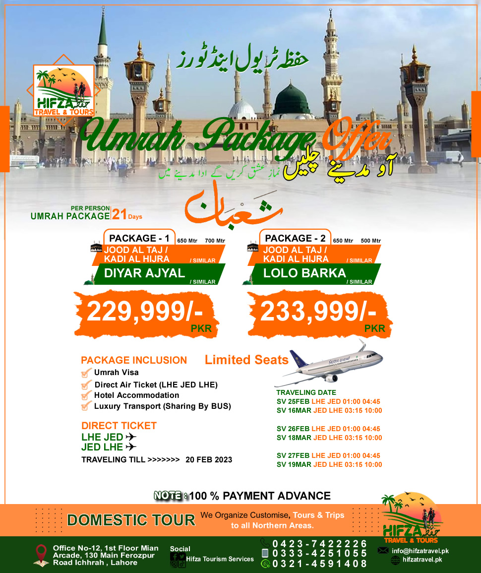 21 DAYS SHABAN UMRAH PACKAGESUMRAH PACKAGE - 1MAK: JOOD AL TAJ / KADI AL HIJRA / SIMILAR 650 MTRMAD: DIYAR AJYAL / SIMILAR 700 MTRSHARING PER PAX: RS. 229,999/-PACKAGES INCLUSION:UMRAH VISADIRECT AIRLINE (SAUDI AIRLINE)HOTEL ACCOMMODATIONTRANSPORT BY BUSHifza Travel & ToursFor Booking & Customized Tour Call/WhatsApp📞 042-37422226🤳🪀 wa.me/923214591408 🤳🪀 03334251055📧 hifzatravelgroup@gmail.com🌐 www.hifzatravel.pk