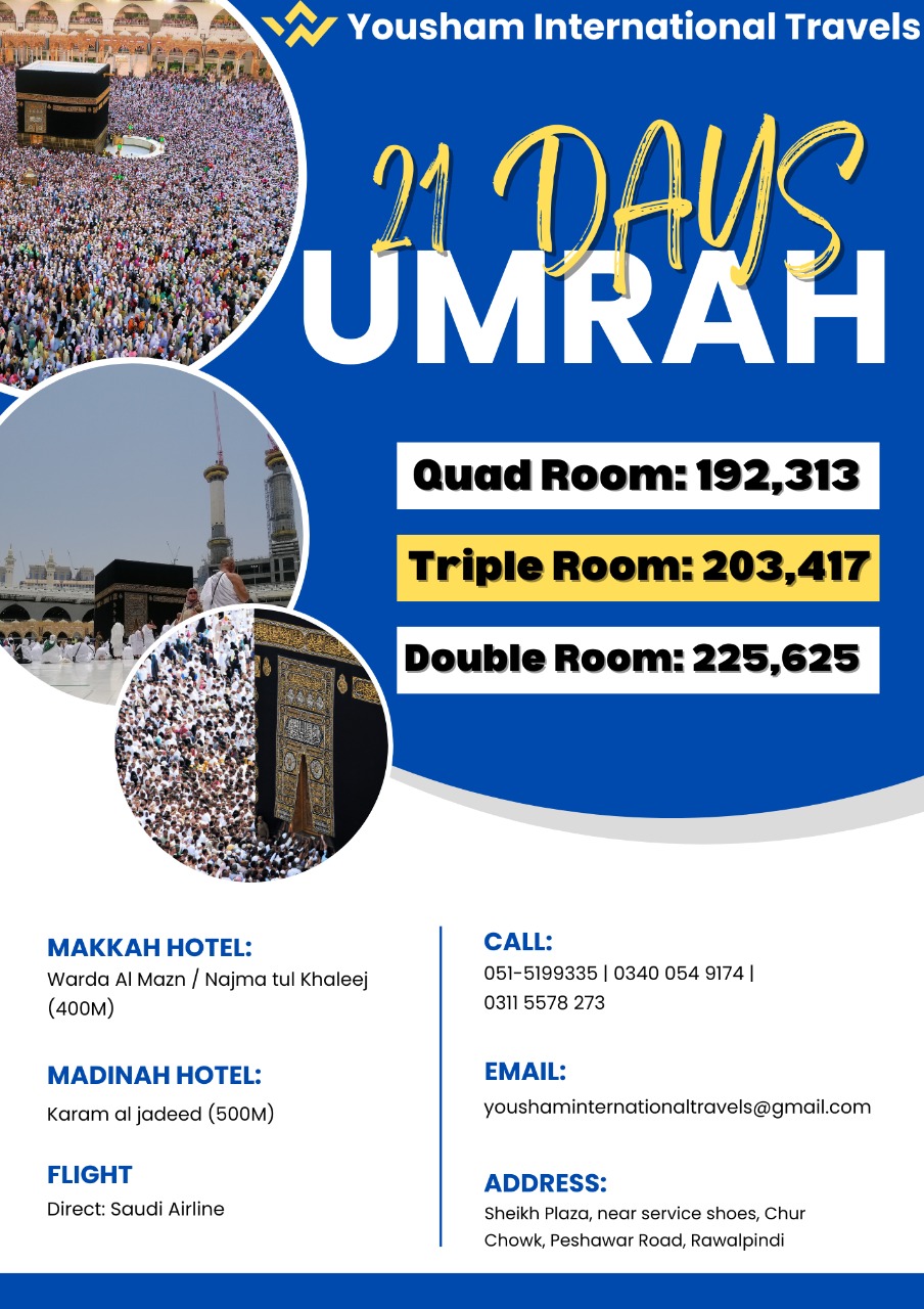Umrah 2022 Packages of Yousham International Travels. 21 Days Package Flight Direct (Saudi Airline) - Makkah Hotel Warda Al Mazn/Najma Tul Khaleej - Distance: 400M - Location: Hijra Road - Madinah Hotel Karam Al Jadeed (500M) - Gate no 7 For more details about Umrah Packages, domestic and international Tickets and Visas, contact us at 051-5199335 0340-0549174 0311-5578273 youshaminternationaltravels@gmail.com Yousham International Travels, Sheikh Plaza near service shoes, Chur Chowk Peshawar road, Rawalpind
